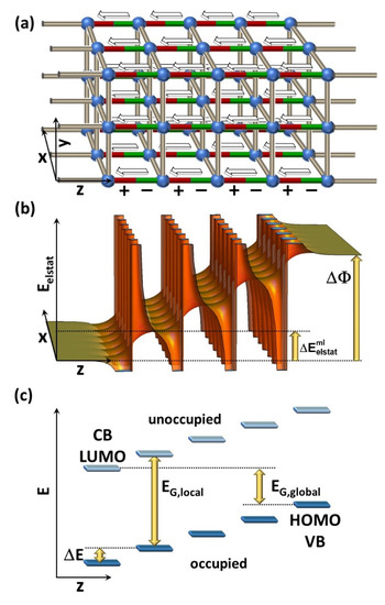 Here, qe is the charge of an electron, ε0 is the vacuum permittivity, µ is the component of each individual dipole moment orientated perpendicular to the layer, and A is the area per dipole. Provided that the polar layers do not interfere with the intrinsic electronic properties of the semiconducting material between the layers, the frontier levels between successive semiconducting regions (e.g., layers formed by nodes and apolar linkers) are shifted by an energy, ΔE, which amounts to (see Figure 1c). In this situation, the local band gap within each region, EG,local, remains unaffected by the polar layers [37]. Conversely, the global energy gap as the energetic difference between the highest occupied state and the lowest unoccupied state in the entire sample decreases [37]. From Figure 1c, it can be inferred that this decrease amounts to: