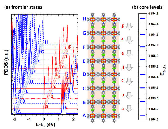 In order to analyze local gaps and the energetic shifts between consecutive layers, we calculated the densities of electronic states projected onto the respective sub-systems [37]. These are shown for the valence region of the PBE calculations for the n = 7 system in Figure 4a (with a plot covering a wider energy range contained in the Supplementary Materials). Here, projections onto layers of BDC-linked Zn-paddlewheels are denoted by uppercase letters and projections onto m2F-BP layers are denoted by lowercase letters. The calculated local densities of states of adjacent equivalent layers have the same overall shape and are rigidly shifted by ~0.26 eV relative to each other. As discussed in Section 2, this can be attributed to the shifts in electrostatic energies (see Figure 1c). When comparing the chemically different BDC-linked Zn-paddlewheels layers and the layers consisting of m2F-BP linkers (e.g., layers A and a in Figure 4) one observes a difference in the onsets of the occupied (unoccupied) DOSs, which amounts to 1.75 eV (1.19 eV). Overall, despite the decreasing global gap discussed above, the local gaps in the different sub-systems remain constant throughout the entire thin films. It amounts to 3.04 eV in the BDC-linked Zn-paddlewheels layers and to 3.64 eV in the m2F-BP layers. The HOMO (VB edge) is localized on the topmost BDC-linked Zn-paddlewheel layer (layer H), while in the PBE calculations, the LUMO (CB edge) is calculated to be in the lowest m2F-BP layer (layer a).