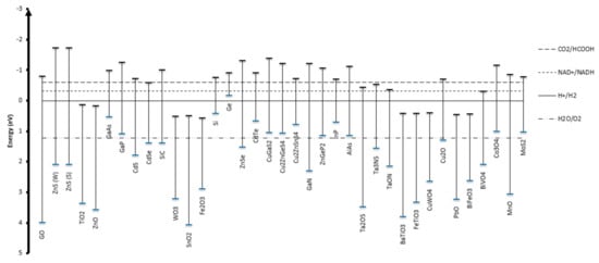 Valence and conduction band edge potentials of various semiconductors, along with reduction potentials for CO2/HCOOH, NAD+/NADH, H+/H2 and H2O/O2.