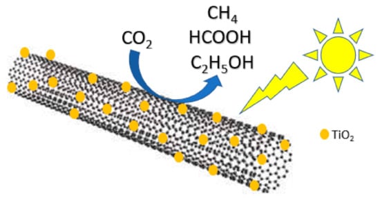 - Xia, X.-H.; Jia, Z.-J.; Yu, Y.; Liang, Y.; Wang, Z.; Ma, L.-L. Preparation of multi-walled carbon nanotube supported TiO2 and its photocatalytic activity in the reduction of CO2 with H2O. Carbon 2007, 45, 717–721. [Google Scholar] [CrossRef]