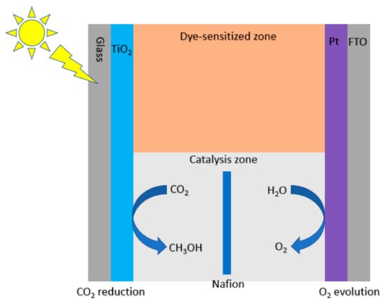 Xia et al. synthesized a multi-walled carbon nanotube (MWCNT) supported TiO2 and found that the addition of MWCNT greatly enhanced the photocatalytic activity of TiO2 (Figure 5) [56]. As with other doped catalysts, it was found that there is an optimal amount of MWCNT before it begins to decrease the photocatalytic activity of TiO2 due to the fact that excessive MWCNT can shield the TiO2 from absorbing UV light. The optimal amount of MWCNT prevents TiO2 from aggregating and can delay electron/hole recombination. Qin et al. made a bifunctionalized TiO2 film containing a dye-sensitized zone and a catalysis zone designed for visible light photocatalytic CO2 reduction (Figure 6) [57]. Electrons transferred from the dye to the conduction band of TiO2 resulted in highly efficient conversion of CO2 to formate, formaldehyde and methanol. After the electron injection, the dye is oxidized to dye+, which can be regenerated by accepting electrons from I− from the electrolyte. Ulagappan et al. studied the photoreduction of gaseous CO2 in Ti-silicate molecular sieves using methanol as an electron donor [58]. The main result of the study is the detection of formate and it was proposed that upon excitation of the metal center, transient Ti+III reduces CO2 while methanol is oxidized.