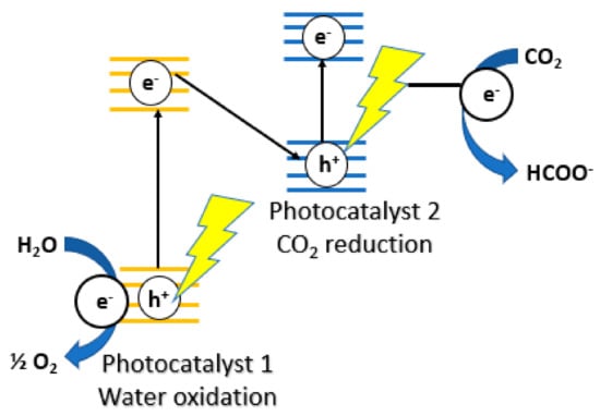 In the 2000s, doping, co-catalyst and extending optical absorption to the visible region became a popular area for research. Sato et al. coupled a p-type semiconductor (N-doped Ta2O5) with a ruthenium complex as an electrocatalyst to produce formate from CO2 [59]. This was the first report of electron transfer from semiconductor in the excited state to a metal complex in the ground state. Triethanolamine (TEOA) was used as an electron donor as well as a proton source and the measured quantum yield was 1.9% at 405 nm. A year later, Sato et al. studied the photoelectrochemical reduction of CO2 over p-type InP/Ru complex polymer hybrid photocatalyst [60]. This reduction, using H2O as an electron donor and proton source was achieved by using a two-step excitation process called a Z-scheme (Figure 7). Highly selective CO2 photo-reduction was achieved by Arai and coworkers by combining Cu2ZnSnS4 (CZTS) with a metal complex electrocatalyst [61]. The main product was identified to be formate, which demonstrates the selectivity and efficiency of the hybrid semiconductor-metal-complex-electrocatalyst catalyst. Suzuki et al. continued on that idea of p-type photoactive N-doped Ti2O5 with a ruthenium complex, which can efficiently reduce CO2 to formate using visible light [62].
