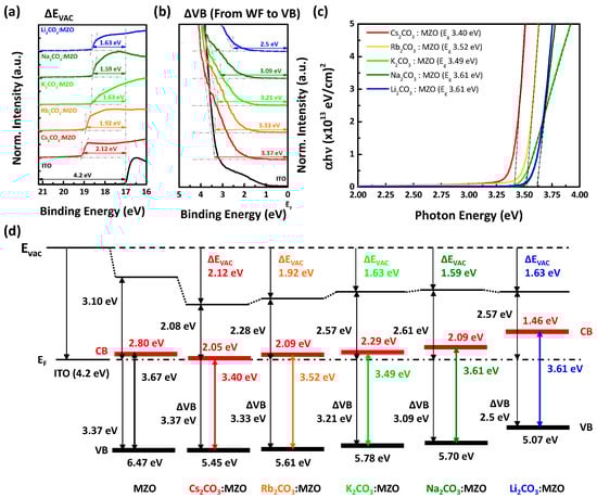 The energy band characteristics of alkali metal carbonate blended MZO ETLs.
