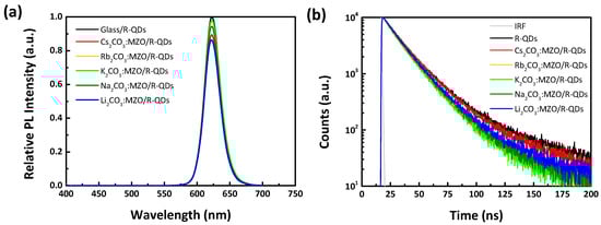 PL and its delay of R-QDs on alkali metal carbonate blended MZO films. (a) Relative PL intensity and (b) time-resolved PL (TRPL) characteristics of R-QDs on alkali metal carbonates blended MZO thin-films. Note that the standard PL intensity and exciton decay time are defined from R-QDs layer on glass substrate.