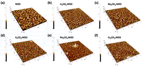 Atomic force microscopy (AFM) images of N2 annealed MZO and X2CO3:MZO thin-films (X = Li, Na, K, Rb and Cs) on ITO substrate. (a) MZO, (b) Li2CO3:MZO, (c) Na2CO3:MZO, (d) K2CO3:MZO, (e) Rb2CO3:MZO and (f) Cs2CO3:MZO thin-films. The thickness of thin-films is ~60 nm and it was deposited on ITO substrate.