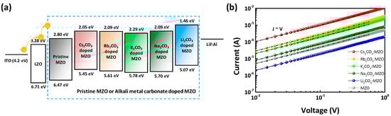 Current-voltage characteristics of pristine MZO and alkali metal carbonate blended MZO thin-films. (a) Energy band diagram and (b) current versus voltage characteristic of electron-only devices (EODs) except QD EML (Structure: ITO/LZO/MZO or X2CO3:MZO (X = Cs, Rb, K, Na and Li)/LiF:Al). Black dash-dot line exhibits the ohmic region of J∝V.