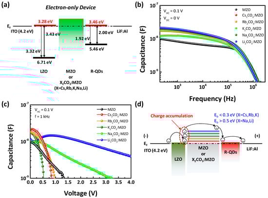 Capacitance and energy band of alkali metal carbonate blended MZO based electron-only devices (EODs) including QD EML. (a) Energy band diagram and (b–d) capacitance of EODs (Structure: ITO/LZO/X2CO3:MZO (X = Cs, Rb, K, Na, and Li)/QD/LiF:Al). (b) Capacitance versus frequency (C-f) and (c) capacitance versus voltage (C-V) of EODs. (d) Charge accumulation mechanism between LZO EIL and alkali metal carbonate blended MZO ETL from C-V characteristic.