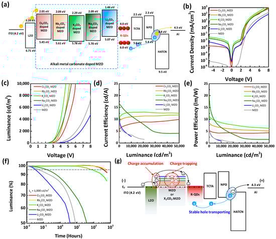 Figure 7 exhibits the device performance and lifetime of the inverted R-QLEDs with X2CO3:MZO ETLs. The energy band diagram of inverted R-QLEDs with X2CO3:MZO ETLs resulted from UPS data are illustrated in Figure 7a and device fabrication process is explained in Experimental Section. Figure 7b–e shows the current density and luminance characteristics as function of voltage (J-V and L-V) and current and power efficiencies as function of luminance (CE-L and PE-L). Compared to the X2CO3:MZO ETL based R-QLEDs, the pristine MZO ETL based one (grey line) exhibited the lower leakage and less forward currents, which can be explained by the high resistance of MZO as reported before []. In Figure 7b, we confirmed that the Cs2CO3:MZO ETL based R-QLED has relatively lower leakage currents because of the smoother roughness property of Cs2CO3:MZO thin-film than others. Also, the Li2CO3:MZO ETL based R-QLED exhibited the lowest current density at forward bias due to the inefficient electron transport of Li2CO3:MZO ETL from LZO to EML induced by the large energy barrier between CBM and WF. Inefficient electron transport hinders the efficient exciton generation in QD EML, so that Li2CO3:MZO ETL based R-QLED exhibited poor luminance and low efficiency as shown in Figure 7c. Figure 7d,e exhibit current and power efficiency of the inverted R-QLEDs with X2CO3:MZO ETLs, respectively. CEmax and maximum power efficiency (PEmax) of inverted R-QLEDs are 16.3 cd/A and 20.5 lm/W with Na2CO3:MZO ETL, but the Na2CO3:MZO ETLs based R-QLED showed large CE roll-off phenomenon with increasing luminance. On the other hands, the Cs2CO3:MZO, Rb2CO3:MZO and K2CO3:MZO ETLs based R-QLEDs exhibited a slightly lower CE than that of Na2CO3:MZO ETLs based one, however, it exhibited the dramatically improved CE roll-off and bright luminance over 150,000 cd/m2. Figure 7f exhibits the operational lifetime of the inverted R-QLEDs with X2CO3:MZO ETLs with the initial luminance (L0) of 1000 cd/m2. For the QLED lifetime measurement, the encapsulated QLED samples are kept in dark box at room temperature with a humidity of ~40%. The lifetime characteristics of R-QLEDs showed a similar trend with CE roll-off phenomenon and the longest lifetime property was achieved for the inverted R-QLEDs with Rb2CO3:MZO ETLs as 620 h (@ T95). The Cs2CO3:MZO ETL based inverted R-QLEDs showed a competitive lifetime of 407 h (@ T95) compared to that of Rb2CO3:MZO ETL based device and detail performances are summarized in Table 5. Figure 7g illustrates the lifetime reduction mechanism of inverted R-QLEDs by introducing alkali metal carbonates into the MZO ETL. In this study, we found that the energy barrier, conductivity, interface and thermal stability of MZO could be controlled by the X2CO3 blending. Especially, we confirmed that the energy barrier in X2CO3:MZO ETLs become larger with decreasing atomic number of alkali metals in carbonate. The increased energy barrier in X2CO3:MZO ETL can generate electron accumulation or trap at interface of EIL/ETL and ETL/EML which degrade device lifetime of QLEDs. Compared to the stable hole transport from anode, the electron accumulation or trap at ETL interface hinder the efficient electron transport into QD EML, as a result, the device lifetime degrades. Therefore, we concluded that the Cs2CO3 and Rb2CO3 are efficient alkali metal carbonates in MZO ETL to improve device lifetime. The summarized lifetime and CE characteristics of inverted R-QLEDs reported in literatures are shown in Table S2. It is noted that Cs2CO3:MZO and Rb2CO3:MZO ETLs based R-QLEDs exhibited the best performances in lifetime.