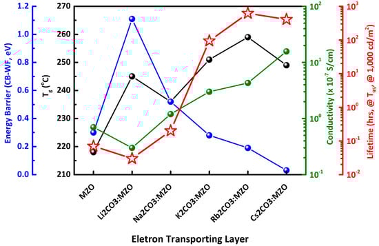 Figure 8 illustrates the summarized blending effect of alkali metal carbonates in MZO ETL for highly stable inverted R-QLEDs. It was found that the important factors to improve lifetime are energy barrier for efficient electron transport, Tg and conductivity of ETL. It is noted that high conductivity and low energy barrier (CBM-WF) of ETL induce a relatively low CEmax performance in R-QLEDs at low voltage, while it increases the lifetime of R-QLEDs along with improving the charge balance in R-QD EML at high applied voltage.