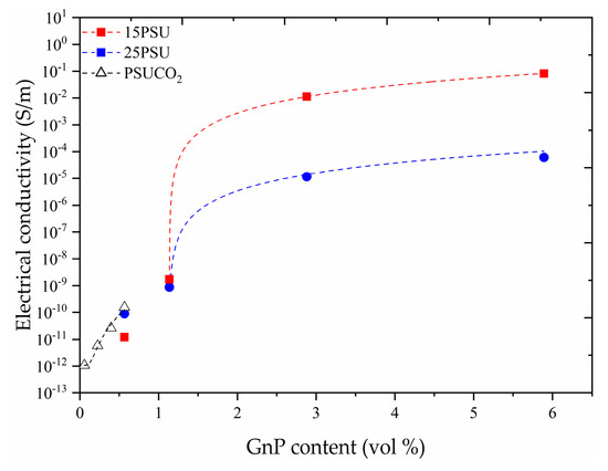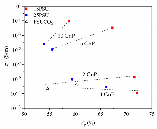 As can be seen in Figure 3, the electrical conductivity increased for all the microcellular nanocomposites with the addition of GnP, reaching values as high as 8.2 × 10−2 S/m with 2.7 vol% (10 wt%) graphene nanoplatelets in 15PSU. The percolation model is commonly used to depict the electrical conductivity of nanocomposites as a function of the amount of conductive particles above a certain critical point, based on the physical contact between them, using: