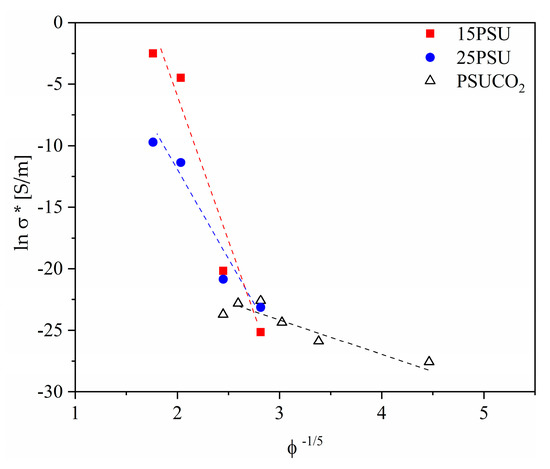 Coefficient of correlation for fitting curves corresponding to the corrected electrical conductivity (σ *) as a function of ϕ−1/3 and ϕ−1/5.