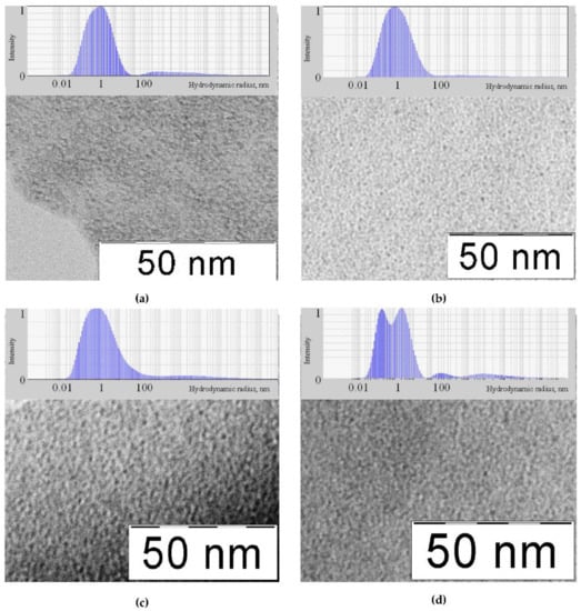 Figure 1 shows TEM images and DLS distribution of molybdenum-tungsten blue particles. According to TEM data, all molybdenum-tungsten blue nanoparticles with different molar ratio [Mo]/[W] were characterized by a particle size of about 3–4 nm, which was confirmed by the DLS results, according to which the most probable hydrodynamic radius of particles was 1.5 nm. The results obtained agree with the data on the size of polyoxometalate complexes given in the literature [].