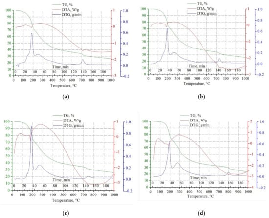To determine the temperature of carbide formation, the differential thermogravimetry was used. DTG, DTA, and TG curves for samples of xerogels with different molar ratio [Mo]/[W] and constant molar ratio [R]/[ΣMe] = 5.0 are presented in Figure 2. In the temperature range of 50–200 °C for all molar ratios [Mo]/[W], there was a change in the sample mass associated with evaporating water in the interparticle space. When the temperature reached 200 °C, bound water presented in the molybdenum-tungsten blue in the form of a hydration shell left. The thermal effect of this process was negative, as can be seen from the given patterns.