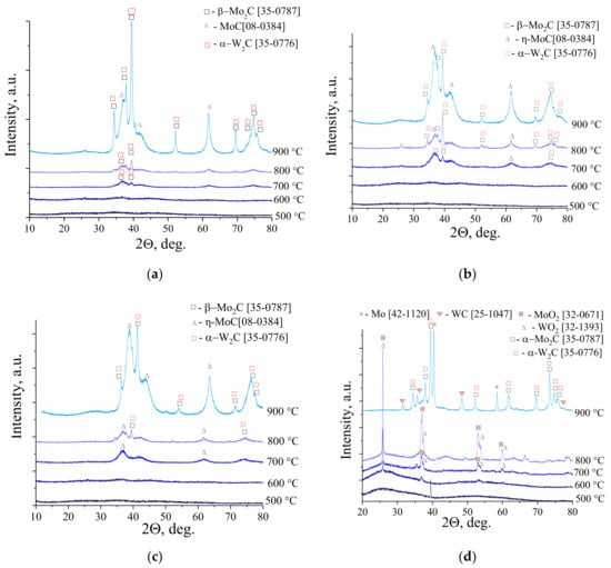 XRD patterns of molybdenum-tungsten blue xerogels collected in the function of temperature for the samples calcined at maximum 900 °C in inert atmosphere with different ratios: (a) [Mo]/[W] = 95/5; (b) [Mo]/[W] = 90/10; (c) [Mo]/[W] = 80/20; (d) [Mo]/[W] = 50/50 ([R]/[ΣMe] = 1).