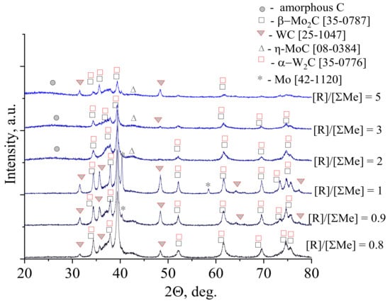 The content of the reducing agent in the dispersion of molybdenum-tungsten had a strong effect on the formation of molybdenum and tungsten carbides, mainly on the final carbon content in the resulting carbides. To establish the optimal molar ratio [R]/[ΣMe], XRD patterns were obtained. For example, XRD patterns for samples [Mo]/[W] = 50/50 calcined at 900 °C are shown in Figure 4.