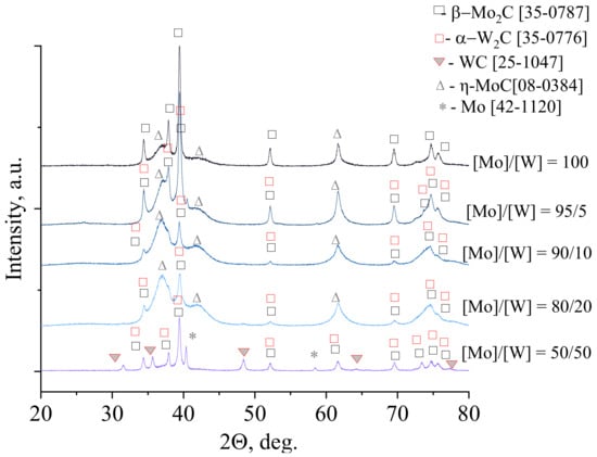 Such changes in the systems [Mo]/[W] = 95/5, 90/10 and 80/20 can be explained by the incorporation of tungsten into the crystal lattice of molybdenum carbide, the formation of solid solutions with high dispersity references, and the phenomenon of broadening of diffraction lines associated with a decrease in the particle size [,]. For the first time, the possibility of the formation of solid solutions in the system was demonstrated in []. Then this was confirmed by researchers using different methods for the synthesis of carbides (metallurgical, electrochemical, chemical vapor deposition with further carburization) [,,].