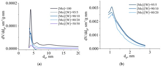 Meso- and micropore size distribution for synthesized binary carbides are shown in Figure 8. As can be seen, the predominant mesopore size for all samples was 4 nm and samples with molar ratio [Mo]/[W] = 95/5; 90/10; 80/20 had also second predominant micropore size—1.2 nm.