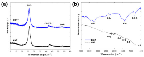 (a) X-ray diffractograms and (b) FT-IR spectra for the BNNTs and CNTs.