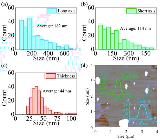 The topological characteristic of PdS2 flakes is tested by using atomic force microscopy (AFM, Bruker Nanoscope 8, Billerica, MA, USA). After analyzing the 220 as-prepared flakes of PdS2, the average lateral dimension of the long axis, short axis, and thickness are determined as 182, 114, and 44 nm, respectively, as shown in Figure 2a–c. Meanwhile, two height profiles of randomly selected flakes from the corresponding AFM image are presented in Figure 2d. The lateral dimension along the marked line of Flake A and Flake B is around 100 and 210 nm, as observed from the inset of Figure 2d. Moreover, the heights of those two selected flakes are determined as about 46 nm. From these results, the topologic properties of the exfoliated PdS2 particles can be determined.