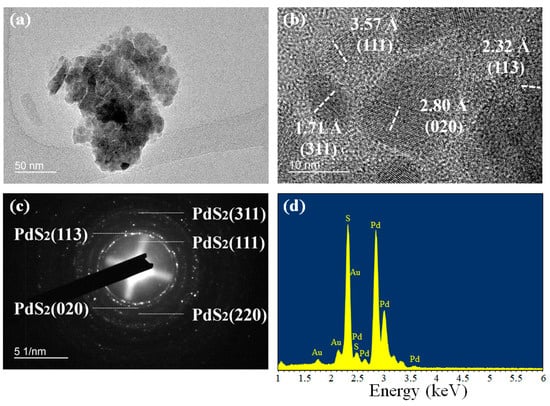 Furthermore, the as-exfoliated PdS2 sample was observed by using field emission transmission electron microscopy (FETEM, JEOL JEM-2100F, Tokyo, Japan) and Scanning Electron Microscope (SEM, Tescan VEGA3, Brno, Czech Republic). An image of randomly selected PdS2 flake from the TEM image is provided in Figure 3a. The grain size of this flake is around 110–190 nm, which is in agreement with the AFM result. In addition, from the high-resolution TEM image (Figure 3b), the crystallinity of this PdS2 flake is also observed. In the HRTEM image, four crystal lattice planes are presented, which are denoted as (311), (113), (020), and (111), with d-spacing of 1.71, 2.32, 2.80, and 3.57 Å, respectively. Meanwhile, the corresponding selected area electron diffraction (SAED) patterns of this PdS2 flake are presented in Figure 3c. Five polymorphic rings are clearly observed, which consist of four previously found crystal lattice planes of (311), (113), (020), and (111), and one additional lattice plane of (220) with a d-spacing of 1.95 Å [38]. In Figure 3d, the energy-dispersive X-ray spectroscopy (EDS) spectrum of PdS2 samples obtained from SEM measurement is shown. From the EDS spectrum, it can be observed that there are three types of signals (Au, Pd, and S) present. The signal of Au is recorded due to the utilization of Au coating during the measurement. Therefore, it can be verified that the sample has no impurities.