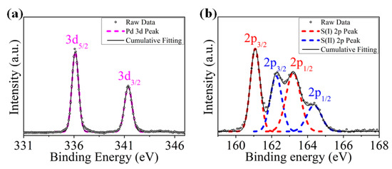 The chemical composition of raw PdS2 powder was tested by employing X-ray photoelectron spectroscopy (XPS, Thermo Fisher Scientific ESCALAB 250Xi, Waltham, MA, USA) measurement with Al Kα X-ray source. Figure 4a presents the Pd 3d spectrum, with two obvious peaks of 3d5/2 and 3d3/2, which are located at the binding energies of 336.2 and 341.6 eV. Meanwhile, the well-fitting result of the S 2p spectrum is observed with two doubles, as shown in Figure 4b, which can be caused by the peak splitting of PdS2 [39,40]. The 2p3/2 and 2p1/2 of S(I) state are found at 161.2 and 163.6 eV binding energy, respectively. While the 2p3/2 and 2p1/2 of S(II) state (fitting at 162.2 and 164.6 eV, respectively) have a similar spectrum to 2p3/2 and 2p1/2 of S(I) state. These results are well matched with the previous study of PdS2 material [25]. The atomic ratio of Pd and S is about 1:2.23 and agrees with the stoichiometric ratio of the PdS2 molecular structure. In addition, there are no obvious sulfate signals, which reveals that the PdS2 sample has high stability at ambient.