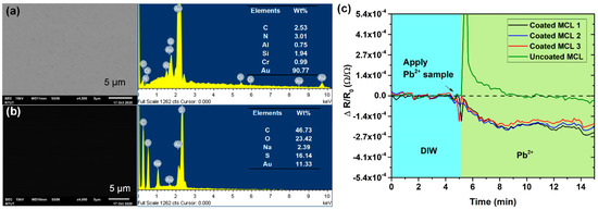 (a) the SEM photograph and EDS spectrum of the gold surface of microcantilever; (b) the SEM photograph and EDS spectrum measured from the poly (3,4-ethylenedioxythiophene):poly(styrenesulfonate) (PEDOT:PSS) coating film on the surface of microcantilever; and (c) response in resistance change as a function of time, for microcantilevers coated with and without the PEDOT:PSS sensing film on the gold surface after the injection of a 100 ppm Pb2+ solution.