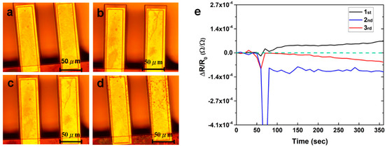 The optical microscopic images of PEDOT:PSS films coated on microcantilevers: (a) before exposure to 10 ppm of Pb2+ solution; (b) after exposure to 10 ppm of Pb2+ solution for the first measurement; (c) after the second measurement; (d) after the third measurement; and (e) each signal response of the sensor for the three separate measurements in a 10 ppm of pb2+ solution.
