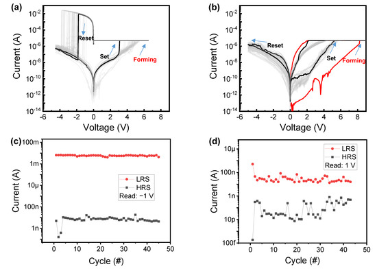 - Lanza, M.; Wong, H.-S.P.; Pop, E.; Ielmini, D.; Strukov, D.; Regan, B.C.; Larcher, L.; Villena, M.A.; Yang, J.J.; Goux, L.; et al. Recommended Methods to Study Resistive Switching Devices. Adv. Electron. Mater. 2018, 5, 1800143. [Google Scholar] [CrossRef]