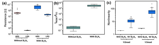 - Kim, S.; Kim, H.; Jung, S.; Kim, M.H.; Lee, S.; Cho, S.; Park, B.G. Tuning resistive switching parameters in Si3N4-based RRAM for three-dimensional vertical resistive memory applications. J. Alloy. Compd. 2016, 663, 419–423. [Google Scholar] [CrossRef]