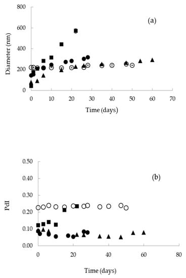 Storage stability of o/w nanoemulsions: (a) Droplet size and (b) polydispersity index (PdI) as a function of time. (▲): L1; (■): L2; (●): H1; (○): H2.