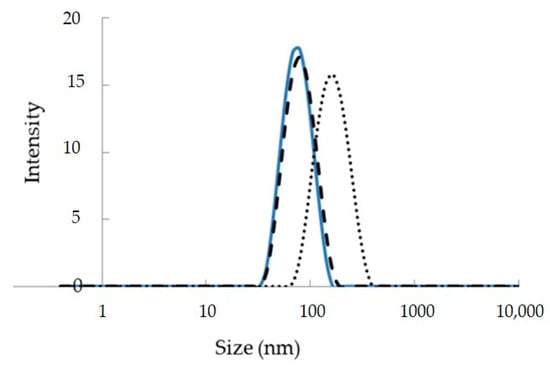 Droplet size distribution of empty and loaded L1 nanoemulsions. Encapsulation of vitamin D3 and curcumin in low-energy o/w nanoemulsions based on water, IPM, Tween 80, Labrasol, Maisine and Transcutol (L1). (─): empty, (- - -): loaded with vitamin D3, (…): loaded with curcumin.