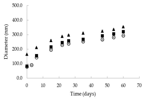 DLS measurements of L1 nanoemulsions showed that vitamin D3 addition in the dispersed oil phase caused a small increase in the size of the oil droplets from 78.6 ± 0.2 nm to 83.6 ± 0.3 nm (Figure 2). The PdI was slightly increased from 0.092 ± 0.003 to 0.102 ± 0.005. Similar behaviour has been observed when vitamin D3 was encapsulated in o/w nanoemulsions based on water, EVOO and a 10:1 mixture of Tween 20 with lecithin []. In a previous study of our group, vitamin D3 was added in the oil cores of 3 different o/w nanoemulsions formulated with water, edible oils and Tween 20 or Tween 20/lecithin mixtures as emulsifiers. In this study, the size of the oil droplets was increased upon vitamin D3 encapsulation in a concentration dependent way []. This behaviour could be possibly related to vitamin’s interaction with the surfactants layer affecting both interfacial tension and overall emulsion stabilization. Storage stability of vitamin D3 loaded nanoemulsions at 25 °C was tested by DLS analysis of droplet size over time (Figure 3). Although the diameter of the oil droplets was gradually increased with time up to 320 nm, the nanoemulsions remained physically stable for 60 days.