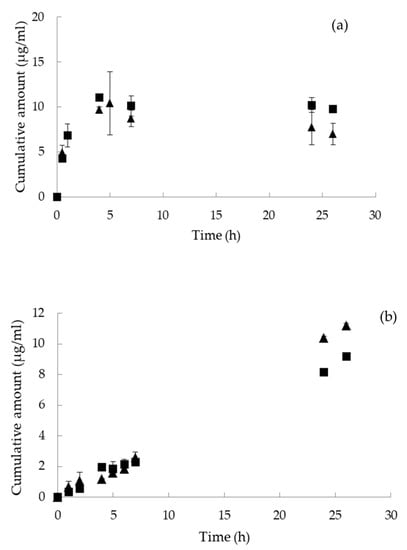 In vitro release experiments were started by placing a certain amount of each loaded nanocarrier in the donor compartment of the cell. The in vitro release profiles of vitamin D3 and curcumin from the formulations were investigated for 26 and 28 h, respectively, in 1:1 PBS buffer/ethanol solution (1:1).
