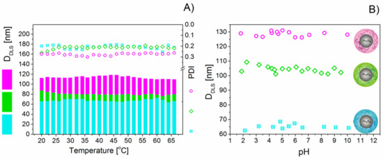 The stability of the DEXx-MF samples was monitored using the Zetasizer Nano ZS by monitoring their DHYDR as a function of temperature and pH. As seen in Figure 3A, the changes in the average DHYDR of the DEXx-MFs are plotted as a function of temperature. DLS measurements were conducted at temperatures ranging from 20 to 65 °C at a 2 °C step and allowing temperature stabilisation for a period of 2 min before each measurement. No change in the DHYDR of the particles was observed between 20 and 65 °C, confirming the thermal stability of the DEXx-MFs. In terms of colloidal stability, all DEXx-MFs showed very good stability against pH changes in the measured region. No significant changes in the DHYDR of the DEXx-MFs were observed in the whole measured pH range (Figure 3B).