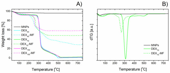 Taking into account that all DEX is decomposed at 750 °C and the magnetite shows thermal stability in the measured temperature range, the difference between the remaining weight of the magnetite and DEX-coated samples at this temperature can be related to the amount of DEX bound on the MNPs. As seen in Figure 4A, this amount strongly depends on the DEX MW. At 750 °C, the DEX40-MF, DEX70-MF and DEX150-MF samples exhibited remaining weights of 28.6%, 48.4% and 58.9%, respectively. Considering the obtained TGA results, the amounts of DEX bound on the MNPs were found to be 2.37, 0.99 and 0.64 mg DEXx/mg Fe3O4 for x = 40, 70 and 150, respectively. The higher the MW, the lower the amount of DEX observed. The decrease in the absorbed DEX amount with increasing MW is in accordance with the results reported for other modifying polymers [48,49].
