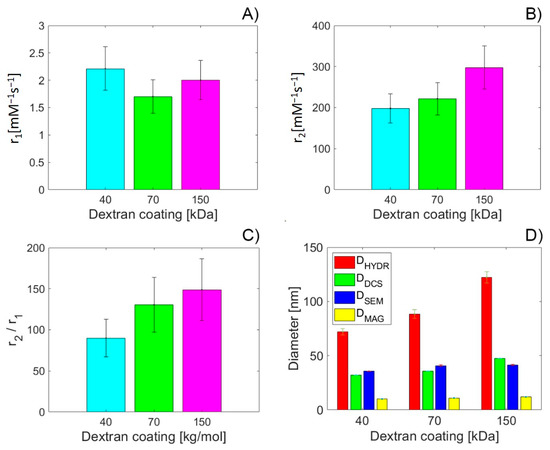 Relaxivity of the DEX-coated MNPs with different MWs of DEX coating. Longitudinal relaxivity r1 (A); transversal relaxivity r2 (B). Transversal r2 and longitudinal relaxivity r1 ratio of the DEX-coated MNPs with different MWs of DEX coating (C). Diameter of the DEX-coated MNPs with different MW of DEX coating (D).