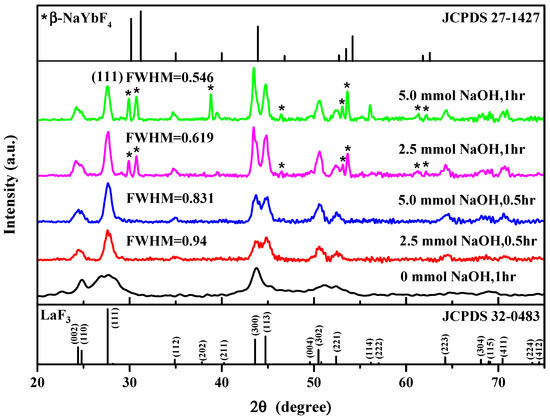 After adding NaOH and performing the reaction for 1 h, additional diffraction peaks appeared in the XRD patterns. We compared these XRD patterns with those of the possible byproducts using the information from the database and found that the additional diffraction peaks originated from the β-NaYbF4 crystal (JCPDS No. 27-1427). β-NaYbF4 showed a similar crystal structure (hexagonal) and UC emission spectra to those of LaF3-type nanoparticles, which have been reported in relevant studies [40,41,42]. Therefore, β-NaYbF4 would not affect the crystal morphology and peak positions of the UC emissions of the LaF3 UCNPs, as confirmed in the following section based on the PL spectra (Figure 4).