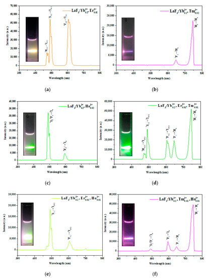 - Razumkova, I.A.; Denisenko, Y.G.; Boyko, A.N.; Ikonnikov, D.A.; Aleksandrovsky, A.S.; Azarapin, N.O.; Andreev, O.V. Synthesis and upconversion luminescence in LaF3:Yb3+, Ho3+, GdF3: Yb3+, Tm3+ and YF3:Yb3+, Er3+ obtained from sulfide precursors. Z. Anorg. Allg. Chem. 2019, 645, 1393–1401. [Google Scholar] [CrossRef]