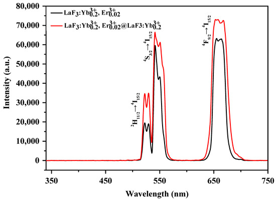 Photoluminescence spectra of LaF3:Yb3+0.20, Er3+0.02 core UCNPs and LaF3:Yb3+0.20, Er3+0.02@LaF3:Yb3+0.20 core/shell UCNPs.