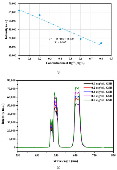 Except for the electron transfer, the ion-bonding may lead to PL quenching; however, the former effect may play a more important role [50]. Upon increasing the loading of Hg2+, the fluorescence intensities of the UCNPs decreased, whereas the fluorescence quenching increased. However, the fluorescence intensity could be recovered after adding a certain amount of GSH to the UCNPs/Hg2+ solution. As GHS and Hg2+ formed a stable Hg–S bond [53,54], the UCNP–Hg2+ coordination complexes were removed, leading to the recovery of the fluorescence intensity.