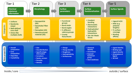 Proposed hierarchy (from inside out) of five tiers needed to describe the chemical and structural complexity of engineered NMs, with different tier categories (yellow panels) and NM-related properties (blue panels). While most published literature does not provide detailed characterization of all tiers (especially Tiers 3 and 5) it is becoming clear that such information is necessary to connect NMs properties to their effects [41]. Computational approaches may be very useful here by estimating surface properties and their relationships to toxicity, and for differentiating different nanoforms * and the boundaries between sets of nanoforms (* see the regulatory case study for further details on nanoforms [42]).