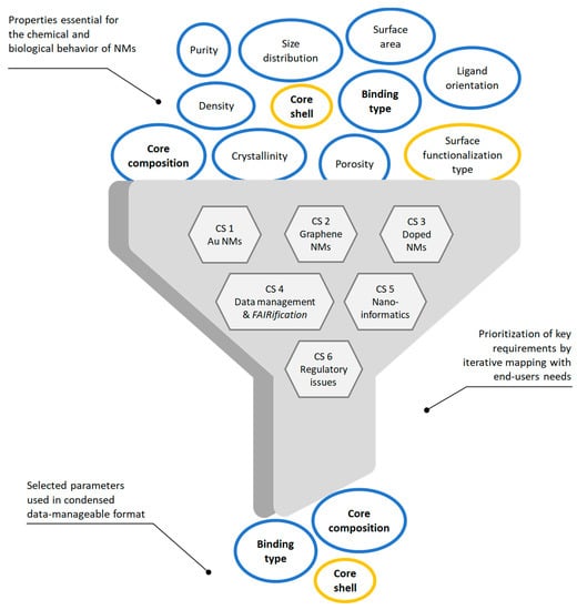 Schematic of the approach to determine the essential components of the NInChI from the six case studies that encode the NM-specific aspects identified by experimentalists (CS 1–3) by iteratively mapping them to the needs of the end-users (CS 4–6). This prioritization process recommended the layers essential for a structural notation for NMs that allow discrimination between unique nanoforms of the same material (tier categories in orange, NM-related parameters to be determined/as produced in blue, with detailed descriptions as per Figure 1).