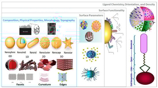 Overview of characteristic properties of Au-based NMs highlighted in case study 1—dimension/shape of core, size and its distribution, surface functionalization, and types of bonding. Chemical composition, physical properties, morphology, and nanotopography of the core (light blue text) correspond to Tiers 1 and 2, surface parameters, functionality, ligand chemistry, orientation, and density (in gray) correspond to Tiers 3–5 of Figure 1.