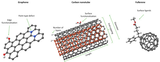 Carbon nanotubes. CNTs have many applications due to their unique structures and exceptional electronic, mechanical and thermal properties [114]. A single-walled carbon nanotube (SWNT) is a sheet of graphene that has been rolled up into a cylinder. It is composed of carbon atoms that form a network of strong sp2 C–C bonds. Graphene sheets, which can be rolled up to construct nanotubes with the zigzag, armchair or chiral structures. CNTs are characterized by the (n,m) notation for the chiral vector that determines two crystallographically equivalent lattice sites. The notation infers several nanotube characteristics indirectly: chirality; number of atoms; circumference; and diameter. All CNT have common attributes such as length, diameter, and open or closed ends (Figure 4). CNTs can also be built from more than one layer of graphene, denoted as multi-walled CNTs (MWNTs) [115,116]. To improve properties like catalytic activity, the surface chemistry of the CNTs can be modified by adsorption or functionalization. Adsorption of different molecules onto CNTs is achieved by electrostatic, π-stacking, hydrogen bonding, and van der Waals interactions. This changes the properties of CNTs without interfering with the graphitic structure. Chemical attachment of functional groups to the CNT sidewalls can change the structure of the CNTs, and modifies their physical properties. CNTs can be functionalized by small organic molecules, polymers, surfactants, metal NMs, biomolecules, etc. CNT structure can be influences=d by synthesis conditions; for example, carbon nanostructures can be doped with various heteroatoms where some carbon atoms in the layer are substituted by heteroatoms like Pt, Fe, B, or N [117,118]. Even a small change in the structure will affect the properties of the CNTs.