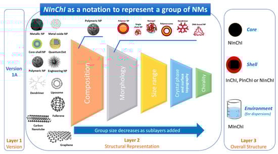 Central to the success of small molecule databases and chemoinformatics approaches has been the availability of unique structural representations for each chemical. These distinguish one chemical compound from another and facilitate unambiguous mapping of chemical substances from different sources, enabling automated data retrieval and exploitation. Beyond the chemical formula nomenclature systems, such as IUPAC’s naming approach for organic chemicals, aim to provide human-readable information on the spatial organization of the atoms, by having an agreed order for identifying branches and functional groups. However, these become very complex for even moderate size chemicals and are complicated to parse for humans and computers, so trivial names are often used that can lead to ambiguities. CAS registry numbers (RNs), for example, are unique numerical identifiers assigned by the Chemical Abstracts Service (CAS) to every chemical substance described in the open scientific literature but, like trivial names, are not systematically connected to structure. Clearly, the cheminformatics field needed a machine-readable representation of chemical structural information. The common line notation formats for describing chemical structures, such as the simplified molecular-input line-entry system (SMILES) [11] and the IUPAC International Chemical Identifier (InChI) [12,13], were devised to describe the chemistry and connectivity of a molecule. Here, we refer to these and the InChI for NMs introduced here as structural representations (or linear notation) to separate them from chemical identifiers like CAS RN where information on the substance requires querying the corresponding registries. Note that InChI and SMILES were developed for chemical compounds that can be accurately and completely described by a chemical graph, whose vertices correspond to atoms and edges correspond to chemical bonds in the compound. This line notation can be used to build the 2 D chemical structure only, as the 3 D structure depends the relative energies of conformations in specific solvents.