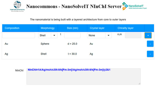 Finally, the recently developed notation for mixtures, MInChI, identifies three main elements as being essential—compounds, quantities, and hierarchy each of which is encoded as a layer of the MInChI [25]. Although not yet part of the standard InChI definition, an open source editor is available that includes several thousand examples. Since the MInChI describes the dispersion of one substance in another and the weight % of the solute, we can adapt it for NInChI in two different ways: to describe cores composed of different chemical components and; to incorporate information about solutions (wt%) for frequently encountered NM dispersions.