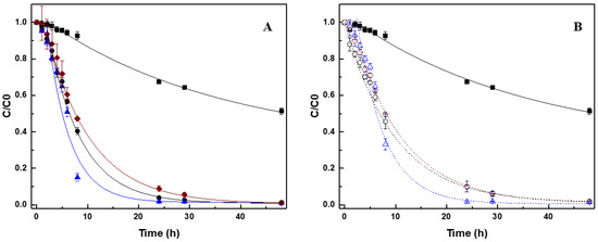 The presence of CNM may also have contributed to the final toxicity of the treated solution, so, the potential toxic effect of the CNM used in the biodegradation assay, was also assessed. The luminescence inhibition obtained was ≤13% for all the materials, except for CNT@2%Fe (INH = 22.3 ± 5.4%) (Table 4). Based on these results, the toxicity is considered negligible for all the tested control samples, except for CNT@2%Fe [44,45]. However, the luminescence inhibition caused by the medium itself, without CNM, was 7.5 ± 2.9%, a similar value to those obtained with the medium incubated with CNM, so this confirms that only CNT@2%Fe, at 0.1 g L−1, exhibited toxicity to V. fischeri.
