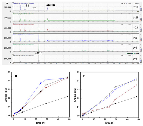 Samples of each reactor withdrawn over time were analyzed by HPLC, aiming to verify the reduction of AO10, and identify the degradation by-products formed during the treatment (Figure 2). AO10 reduction was analyzed at 480 nm and identified at the retention time (Rt) of 10.2 min. The corresponding AO10 peak decreased over the reaction time, and after 48 h of treatment, in the presence of CNM, no AO10 was detected in solution (Figure S3).