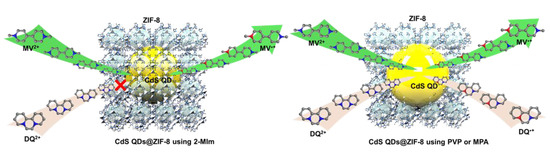 Schematic illustration of molecular sieving effect of CdS QD@ZIF-8 for MV2+ and DQ2+ photoreaction depending on capping agents as indicated.