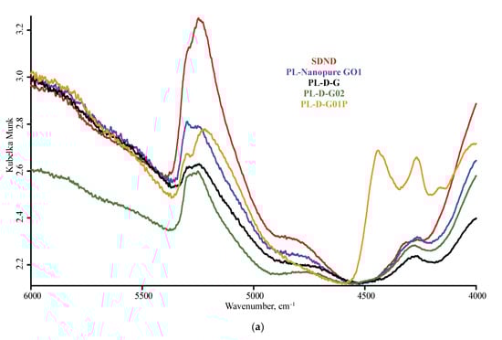 FTIR spectroscopy, usually in the mid-IR region, is widely used to characterize nanodiamonds and their surface groups []. Previous articles on the surface groups of nanodiamonds by FTIR are mostly based on sample-pellet transmission FTIR techniques []; less common are diffuse reflectance FTIR (DRIFT) [] or attenuated total reflectance FTIR (ATR–FTIR) [,]. However, there are several contradictions in the selection and assignment of the main absorption bands of nanodiamonds, a unified scheme of sample preparation for the analysis of nanodiamonds has not been proposed, and rather wide comparative data on different samples or brands of nanodiamonds do not exist.
